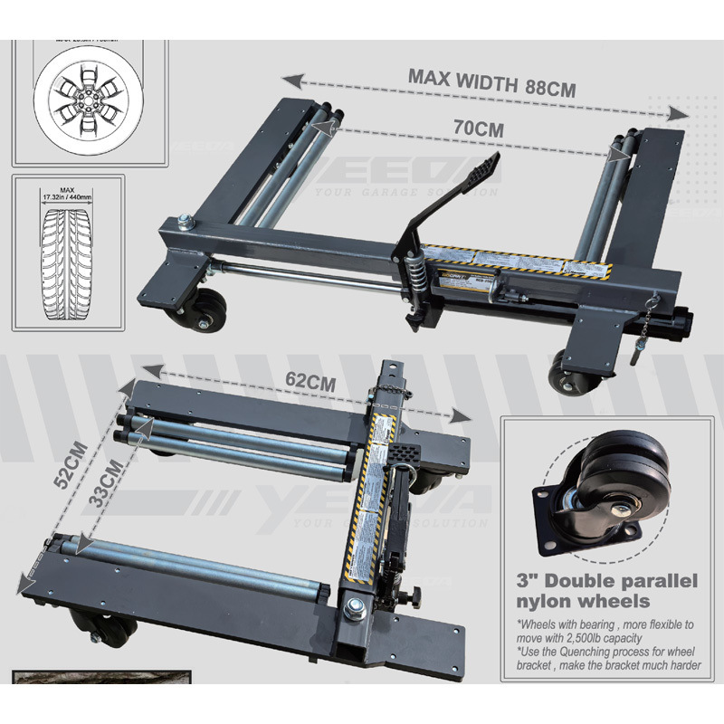 5000LB Kapasite / Çift SUV Araç Dolly, ağır SUV'ları ve off-road araçları taşımak için sağlam bir çözümdür.Araç lastiklerine 29'a kadar sığabilir.3,5 inçlik çift paralel naylon tekerlekler ve rulmanlar, ağır ağırlığı desteklerken esnek hareket sağlıyor.Tekerlek destekleri bir söndürme işlemine maruz kalır, sertlik ve dayanıklılıklarını artırır.Tasarımı, atölyelerde araçların sorunsuz ve verimli manevra edilmesini sağlar.